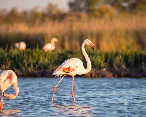 - Wilde Flamingos und weiße Pferde in der Camargue